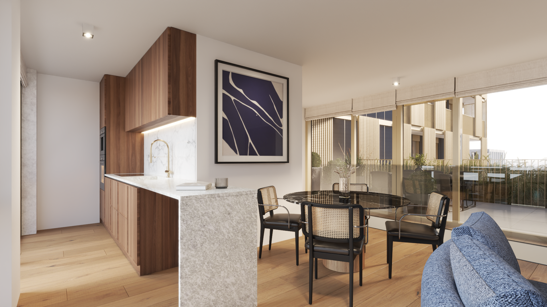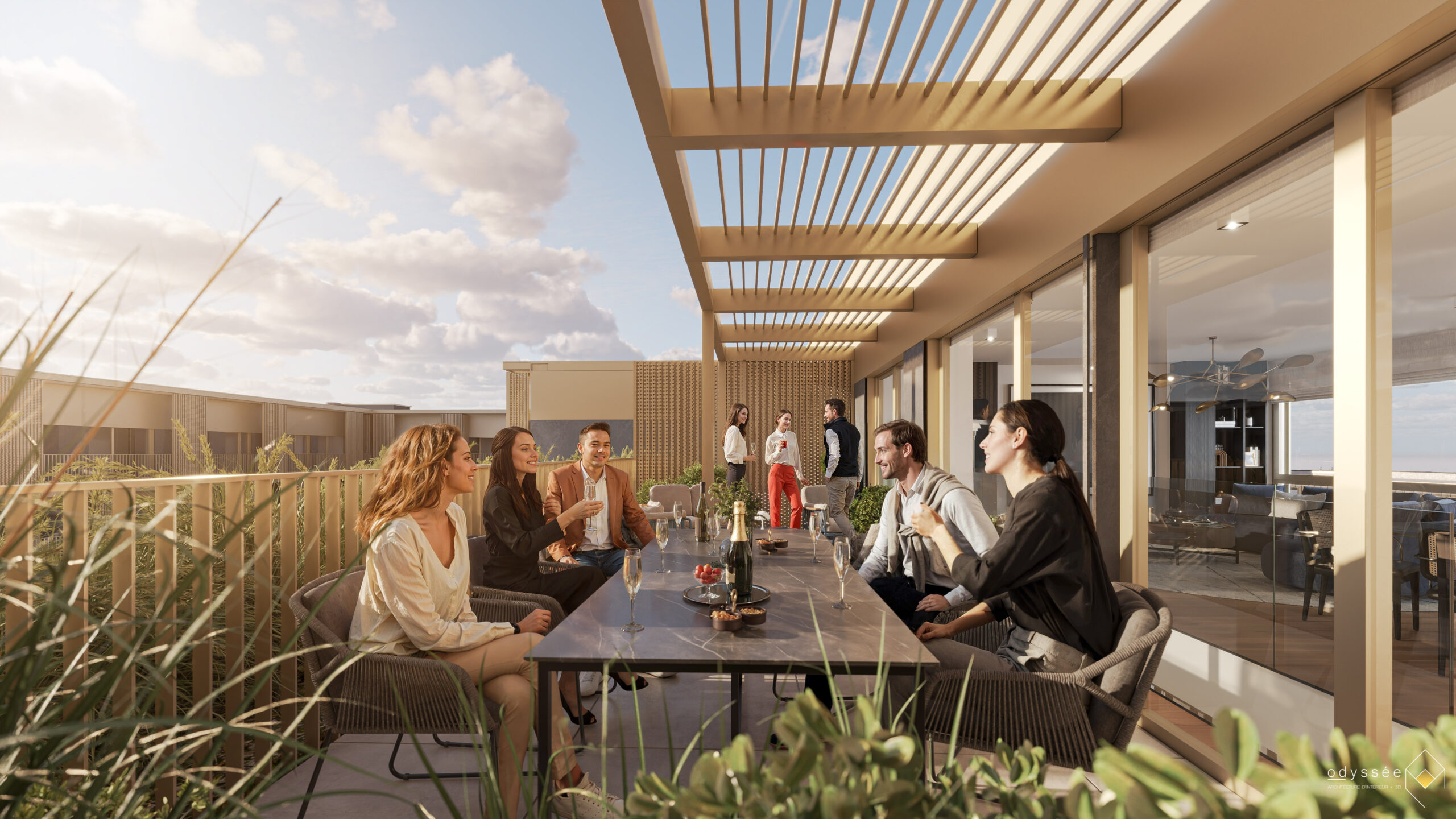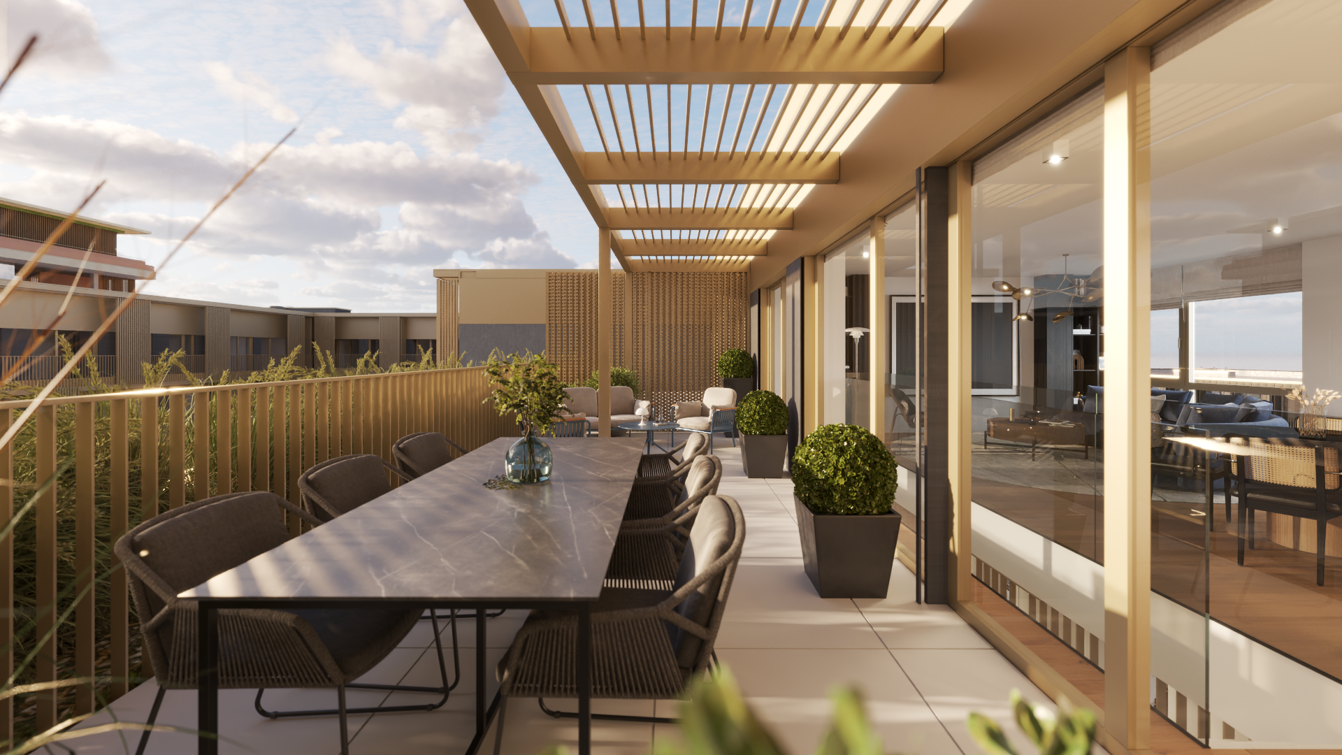 Dans ce bien à acheter en VEFA, les panneaux photovoltaïques et le raccordement au chauffage urbain Sudcal garantissent une énergie propre et une consommation optimisée dans les espaces communs.